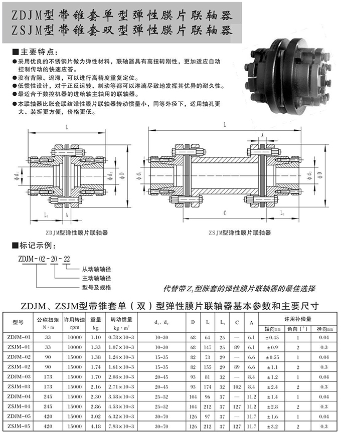 瑞安市寶德隆機械配件有限公司提供ZDJM型帶錐套單型彈性膜片聯軸器ZSJM型帶錐套雙型彈性膜片聯軸器具有拆裝方便,快速安裝等特點,廣泛用于連接/固定輪轂孔和零件的軸,例如齒輪,錐齒輪,鏈輪,葉輪,凸輪,皮帶輪和飛輪等軸的聯結固定,咨詢電話:18906872378