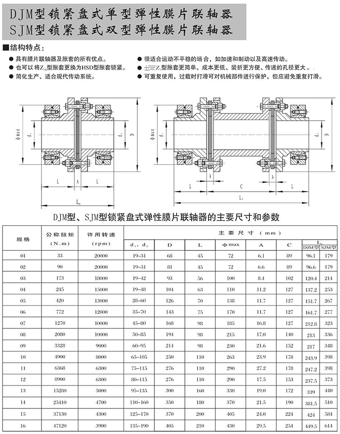 瑞安市寶德隆機(jī)械配件有限公司提供DJM型鎖緊盤式單型彈性膜片聯(lián)軸器SJM型鎖緊盤式雙型彈性膜片聯(lián)軸器具有拆裝方便,快速安裝等特點(diǎn),廣泛用于連接/固定輪轂孔和零件的軸,例如齒輪,錐齒輪,鏈輪,葉輪,凸輪,皮帶輪和飛輪等軸的聯(lián)結(jié)固定,咨詢電話:18906872378
